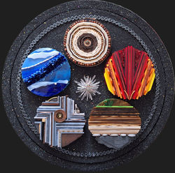 Corroded metal including brake shields, washers, hex nuts, screws and nails, agate slices, quartz crystals, kyanite, asphalt, lava rock, slag, jasper beads, lava beads, smalti, stained glass, metal shavings, copper nails, aquarium gravel, coloured sand. |